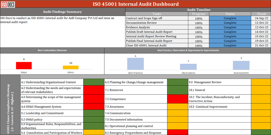 Internal Audit Dashboard provides a real-time overview of audit schedules, findings, non-conformities, and corrective actions, allowing organizations to track compliance with ISO 45001 standards effectively.