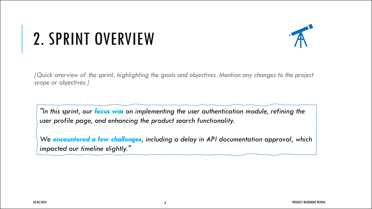- Clear Documentation: With this template, all the information regarding the product increment review can be clearly documented. This includes details about the objectives, scope, milestones, and outcomes of the review.